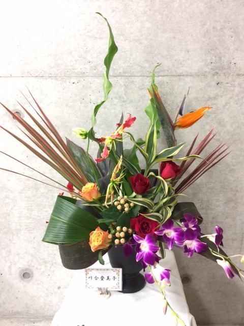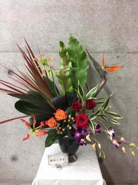 生き生きと波打つタニワタリ、 ハラン、ドラセナ・コンシンネ、 サンデリアーナなど、 ふんだんにグリーンを使い、 ダイナミックなアレンジメントは、 ストレリチア(極楽鳥花)や グロリオサ、赤いバラを得て さらに情熱的に☆*:.。. o(≧▽≦)o .。.:*☆